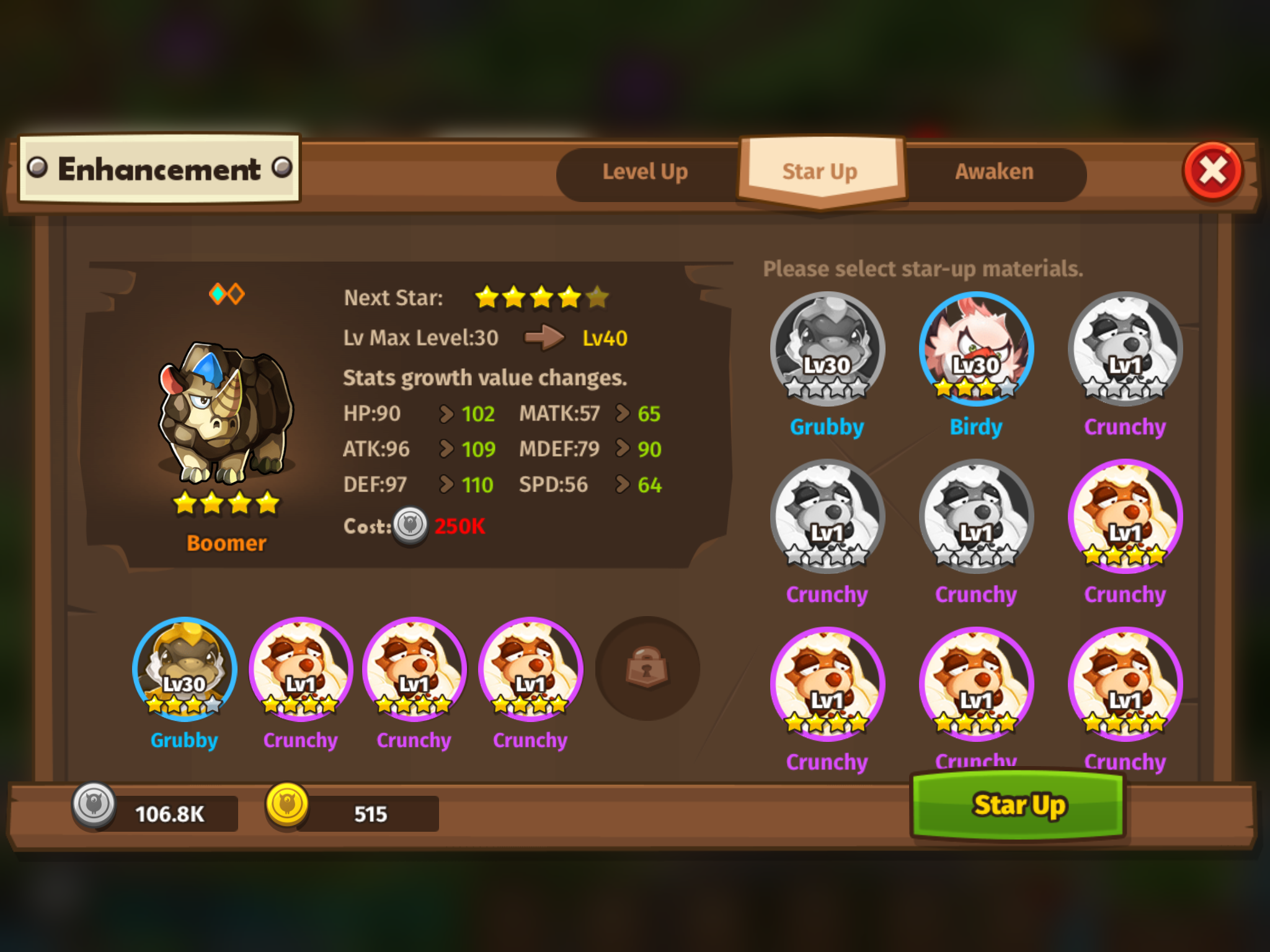 For example, this monster here is a 4*. You cannot level this monster up anymore unless you increase its stars. This will increase the maximum level from level 30—>40. You can star up by sacrificing other monsters with a certain number of stars. For example, in order to star up a 4* monster into a 5* monster, I will need another 4 monsters to sacrifice which all need to be 4*.